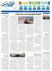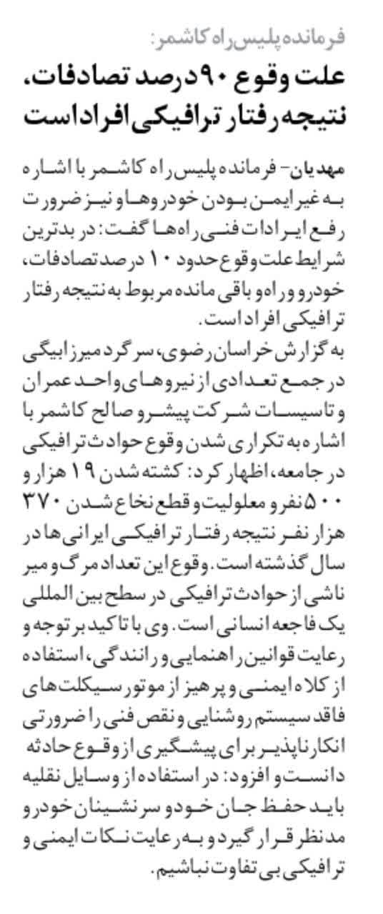 انتشار خبر جلسه فرمانده پلیس راه کاشمر با تعدادی از پرسنل عمران و تأسیسات شرکت پیشرو صالح کاشمر در صفحه 8 روزنامه خراسان مورخ 26 بهمن 1402